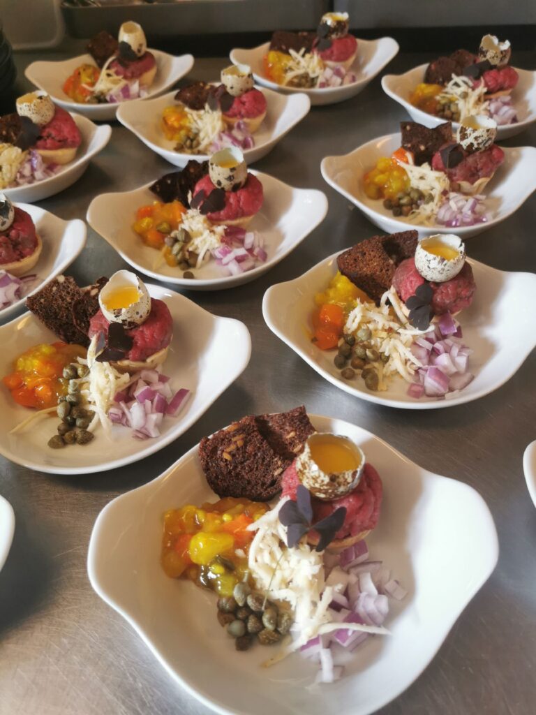 Tatar i bagt skål med rugbrød chips.